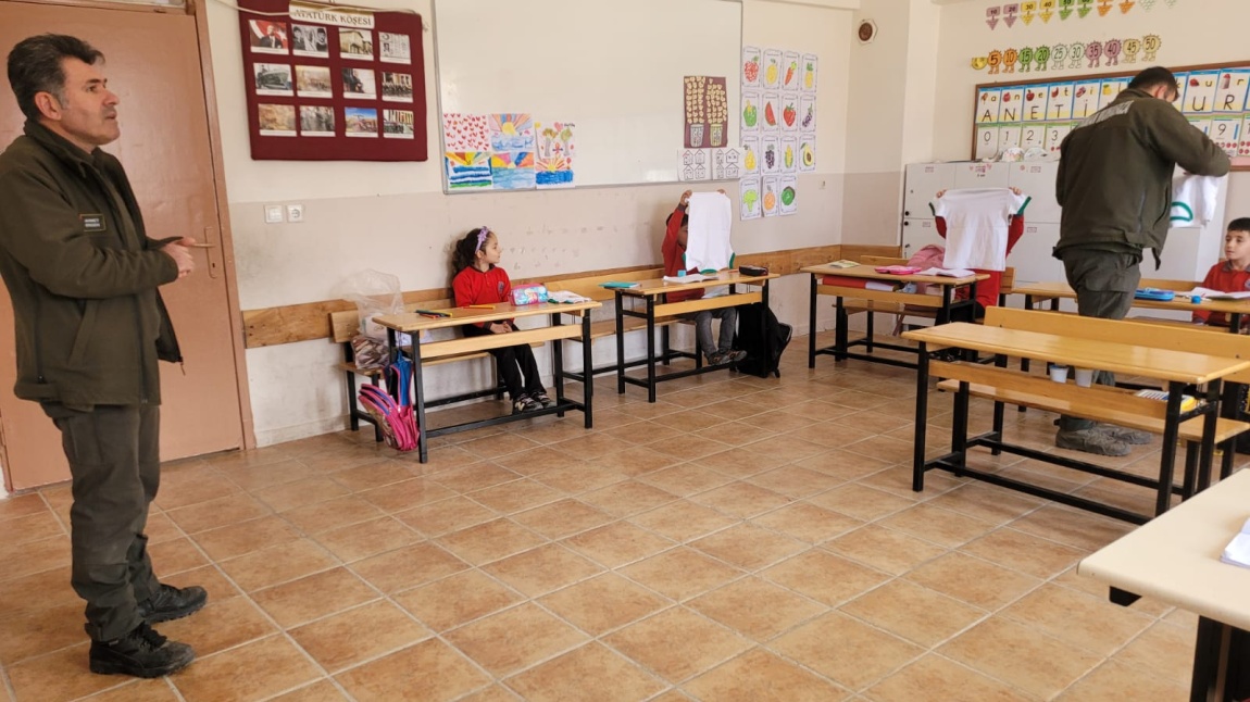 Elmalı Orman İşletme Müdürlüğü'nden gelen görevliler okulumuz öğrencilerine yaz günlerinde yangınlar yoğunlaştığı için yangınların önlenmesi konusunda alınacak tedbirler ile ilgili bilgilendirme yaptı ve hediye olarak getirdikleri tişörtleri dağıttı.